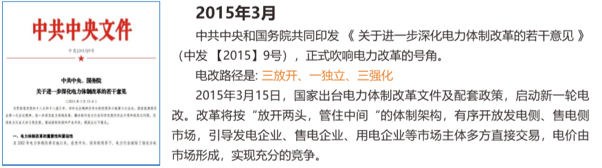 1 • 2015年3月15日中发9号文中共中央和国务院联合发布电改9号文,拉开电改大幕。